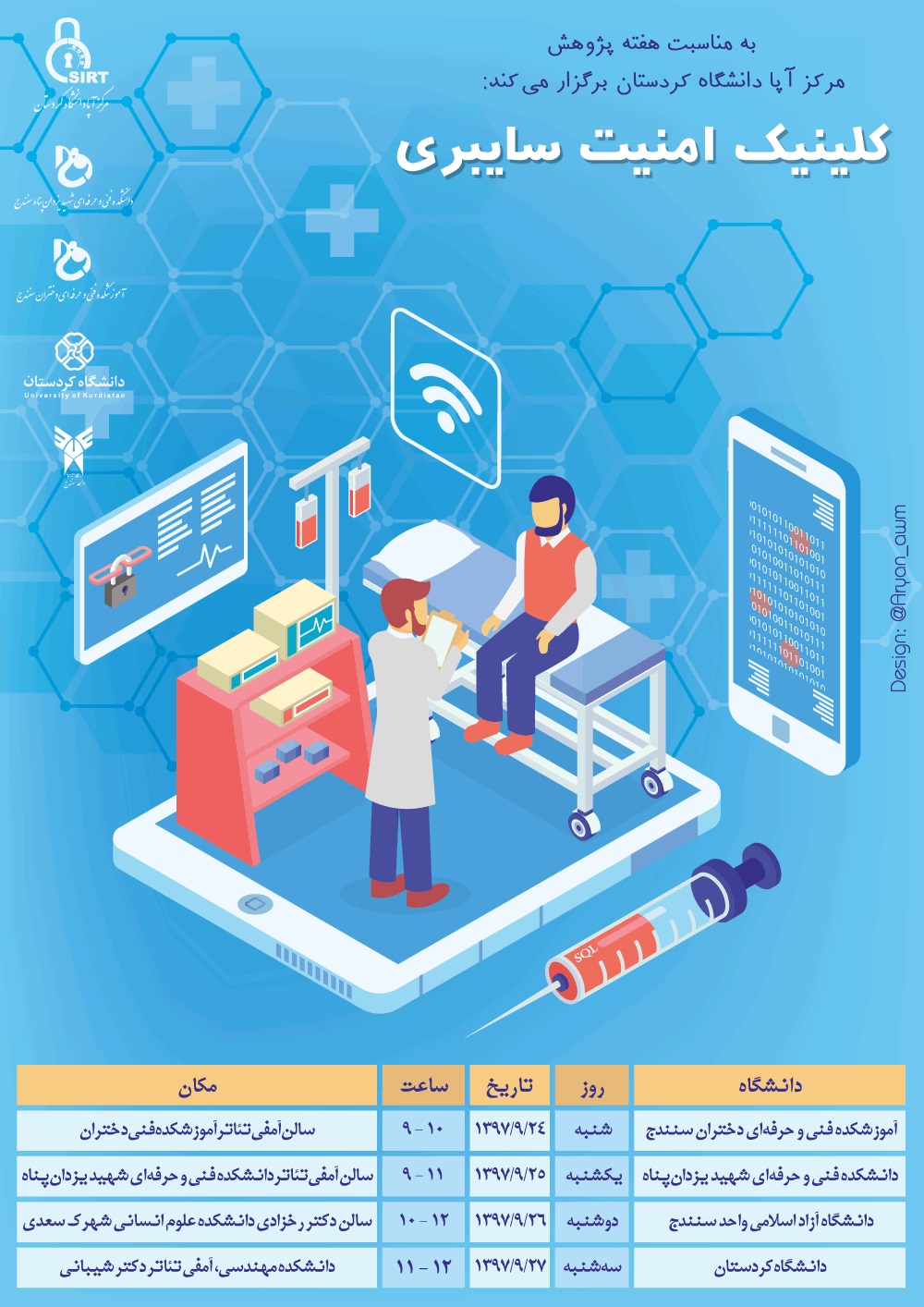 مرکز آپا دانشگاه کردستان به مناسبت هفته پژوهش کارگاه کلینیک امنیت سایبری را در دانشگاه‌های آموزشکده فنی و حرفه‌ای دختران سنندج، دانشکده فنی و حرفه‌ای شهید یزدان‌پناه سنندج، دانشگاه آزاد اسلامی واحد سنندج و دانشگاه کردستان برگزار می‌نماید.