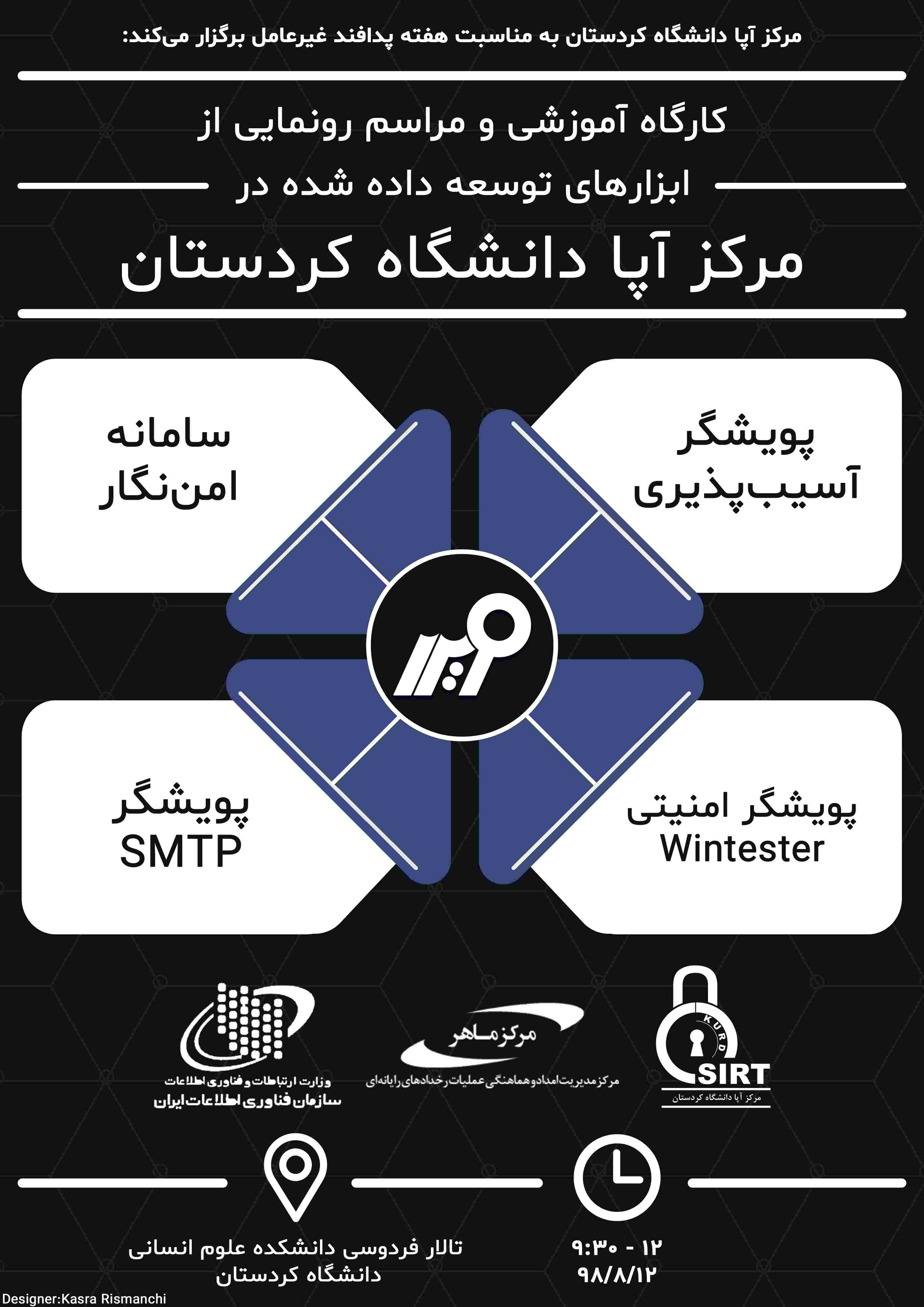 مرکز آپا دانشگاه کردستان به مناسبت هفته پدافند غیرعامل برگزار میکند: کارگاه آموزشی و مراسم رونمایی از ابزارهای توسعه داده شده در مرکز آپا دانشگاه کردستان با حضور مسئولین، شرکتها، مدیران و کارشناسان فناوری اطلاعات ادارات و سازمانهای دولتی استان کردستان برگزار میگردد.
