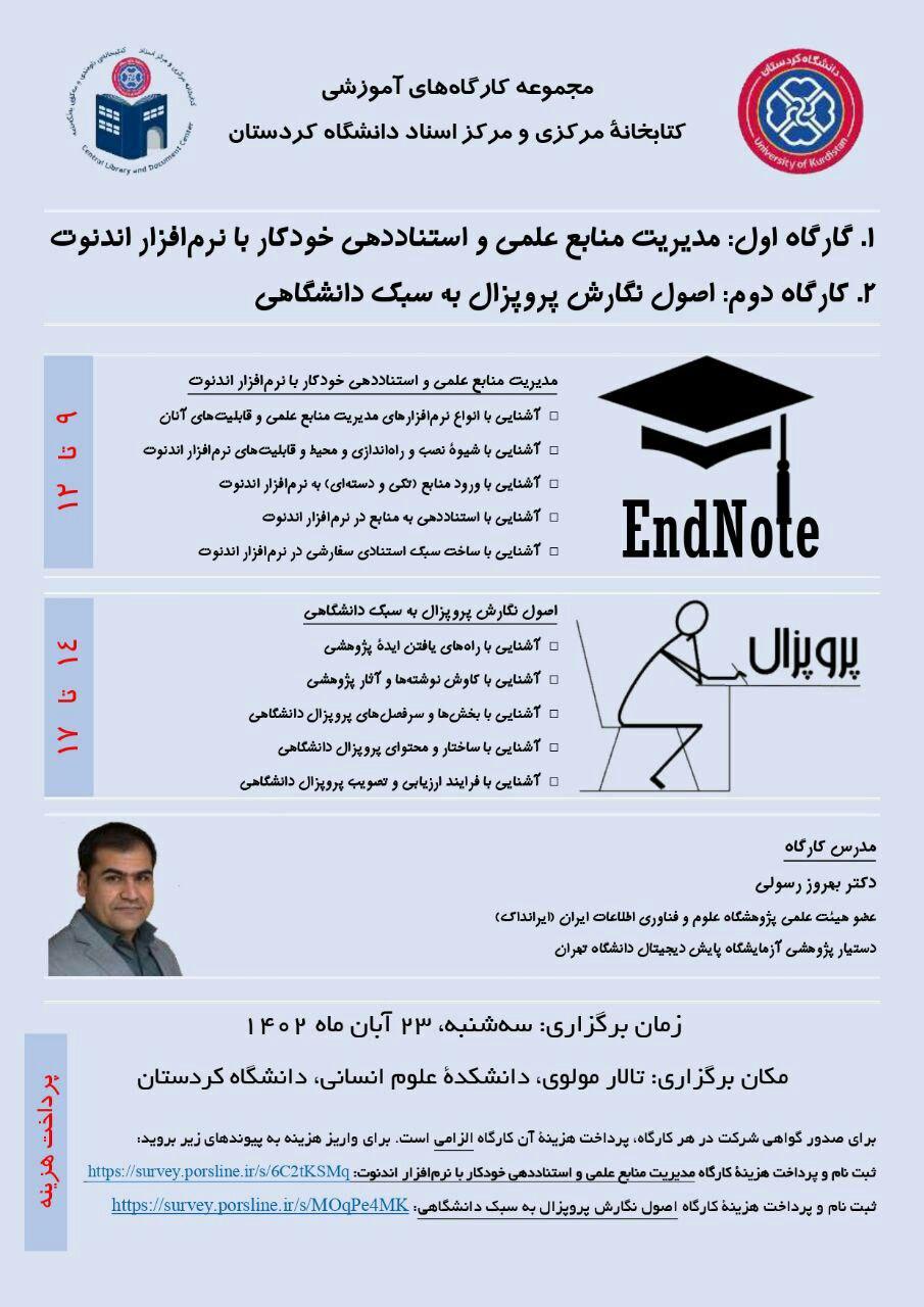 به اطلاع می‌رساند، کارگاه‌های استناددهی خودکار با استفاده از نرم‌افزار اندنوت و پروپوزال نویسی به سبک دانشگاهی در روز سه‌شنبه ۲۳ آبان ۱۴۰۲ برگزار خواهد شد. با توجه به الزامی بودن شرکت در دوره برای دانشجویان تحصیلات تکمیلی و منوط بودن تأیید پروپوزال دانشجویان به داشتن گواهی حضور در هر دو کارگاه، حضور کلیه دانشجویان تحصیلات تکمیلی که تاکنون در کارگاه‌های یاد شده شرکت ننموده‌اند الزامی است.